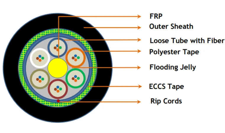 Armoured Multitube cable with Single Jacket Steel Tape Armoured cables are suitable for direct burial as well as for duct applications. This cable is stranded Loose tube cable with Optic fibres are placed inside the robust buffer tube. Stranded around the fibre reinforced plastic (FRP) central strength member. Loose tubes contain water blocking jellyand cable core flooded with jelly and core surrounds with Polyester tape to prevent water ingress in the interstices of cable core. Corrugated steel tape armour surrounds the cable core with HDPE/LSZH jacket.